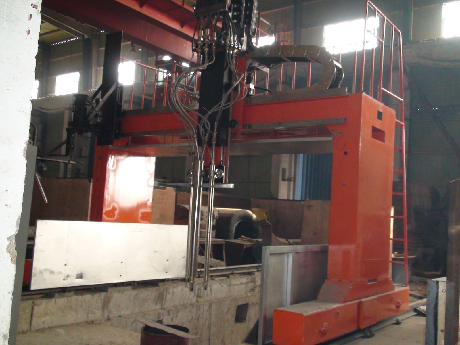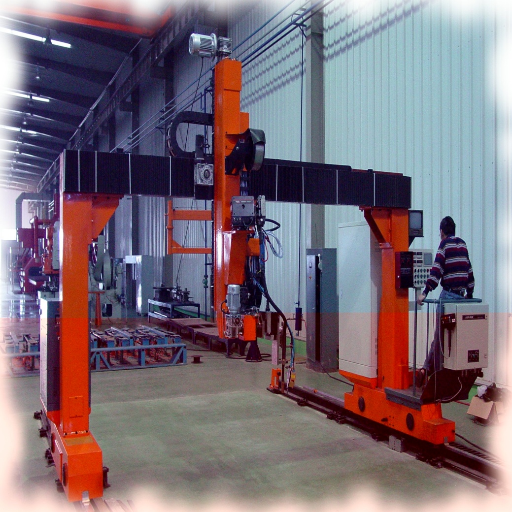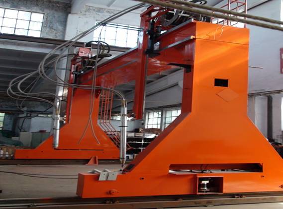 ● 龍門(mén)所配二臺焊機、保護氣氣瓶(至少2個(gè))、控制柜等均放在龍門(mén)兩側托架上,隨龍門(mén)一起移動(dòng),進(jìn)龍門(mén)的外部供電線(xiàn)纜采用滑線(xiàn)供給,使得龍門(mén)移動(dòng)范圍加大。